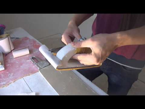 Двигаться следует снизу вверх, укладывая полосы шириной 1 м и делая внахлест около 5 см. Для увеличения эластичности слоя можно вставить тонкую армирующую пластиковую сетку. Ошибки необходимо исправить на месте, пока затирка еще свежая. Перед тем, как начать шлифовать его, нужно дать ему высохнуть. Обычно слой толщиной несколько миллиметров сохнет в течение 24 часов.