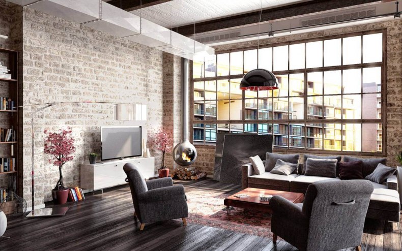 Всем известно, что этот стиль еще называют лофт или фабричный. В соответствии с этим обои для зала можно подобрать с имитацией однотонной серой бетонной стены или просто однотонные серые, а также с тиснением или фотообои с имитацией кирпичной кладки или другие с тематикой лофт.