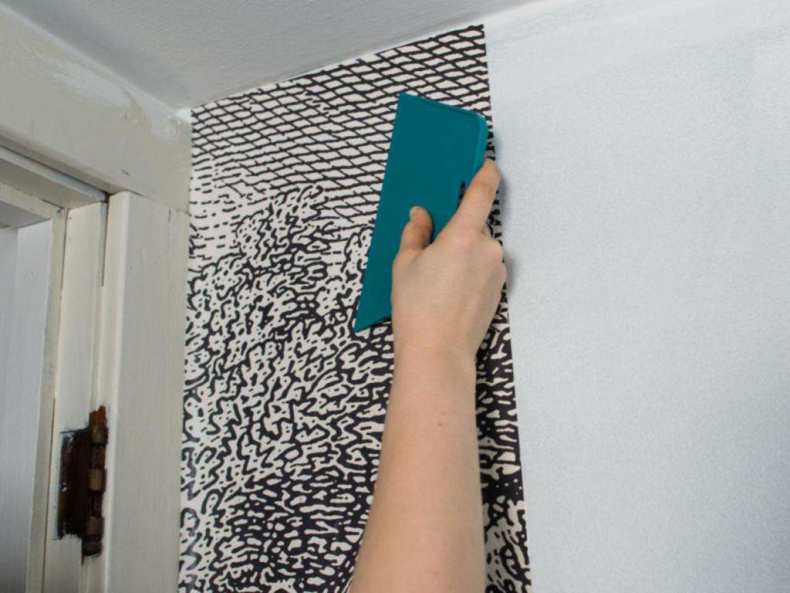 - Полотно разравнивают пластиковым шпателем движениями сверху вниз и от середины в стороны.